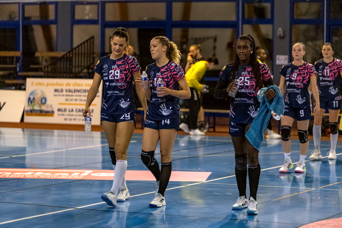 LALIE LAMBET, Aminata Doucouré - LALIE LAMBET, Ines GODET, Camille-Victoire Tourigny, Aminata Doucouré - Match de Handball Féminin de division 2 du 29 Septembre 2023 à la salle Coubertin de Maubeuge - SAMBRE AVESNOIS vs LE HAVRE